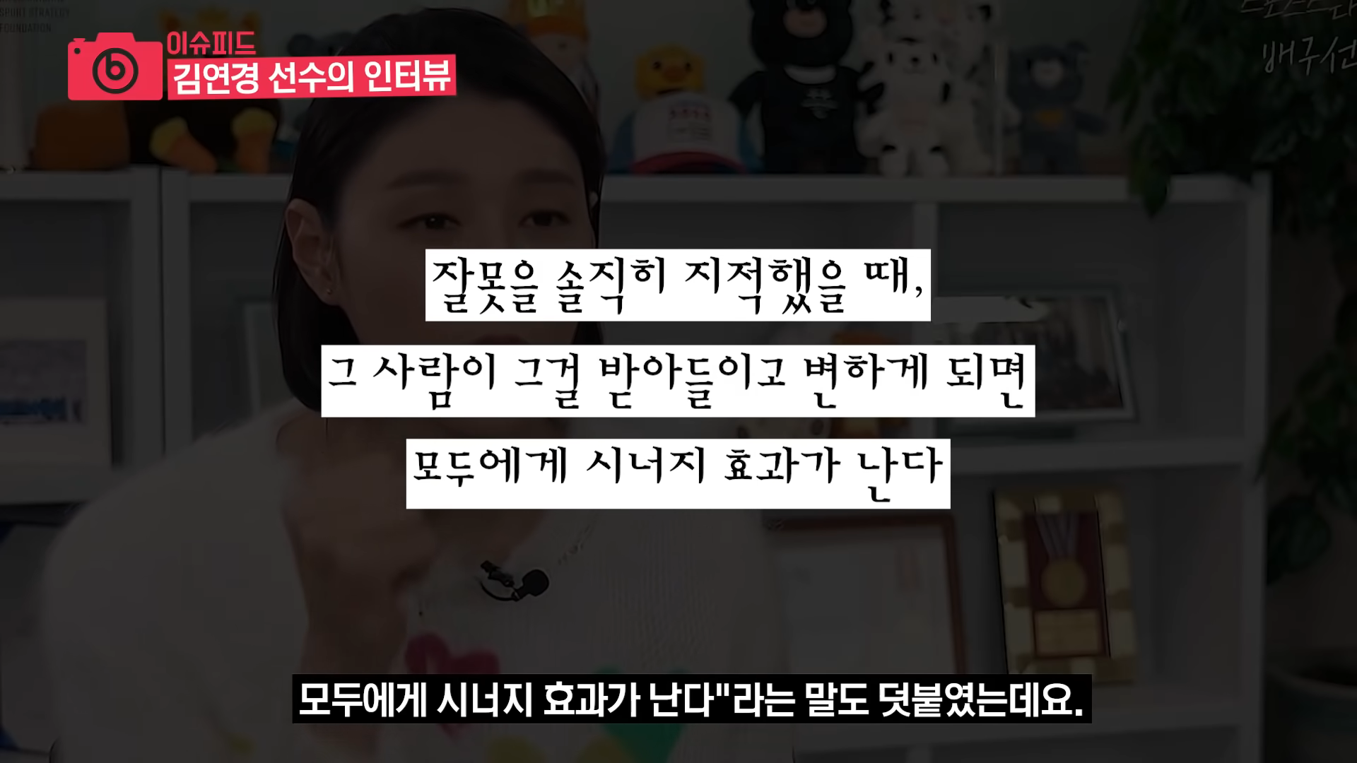 해당 인터뷰 영상에서 김연경 선수는 잘못을 솔직히 지적했을 때 그 사람이 그걸 받아들이고 변하게 되면 모두에게 시너지 효과가 난다는 말도 덧붙였는데요.