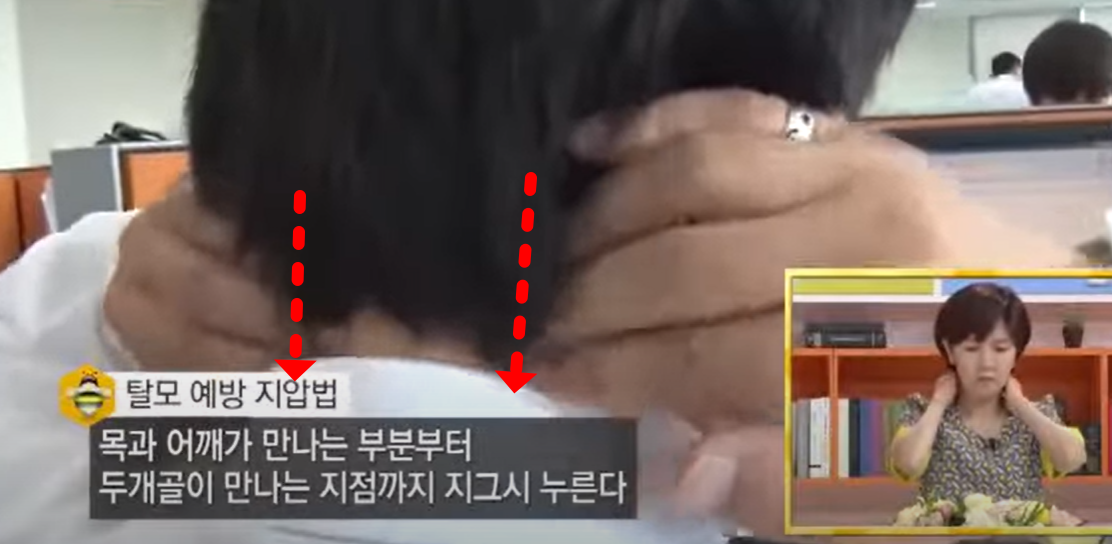 목과 어깨가 만나는 부분부터 두개골이 만나는 지점까지 지긋이 누르면서 마사지를 해줍니다.