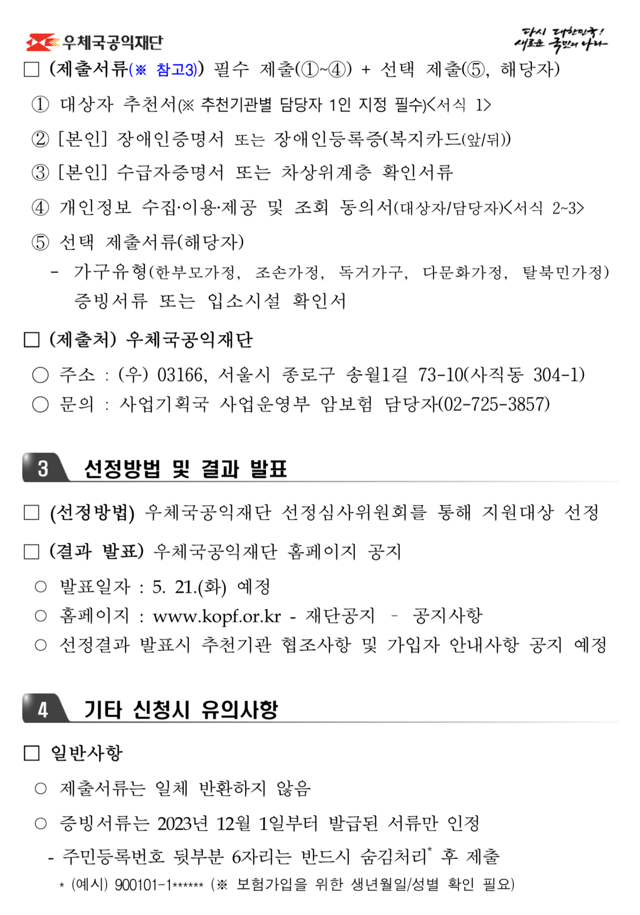 신청 희망자는 전국 장애인복지관·장애인주간보호시설·장애인직업재활시설 등의 추천을 받아 다음 달 2024년 3월 14일까지 우체국공익재단에 우편으로 신청서류를 보내면 됩니다.