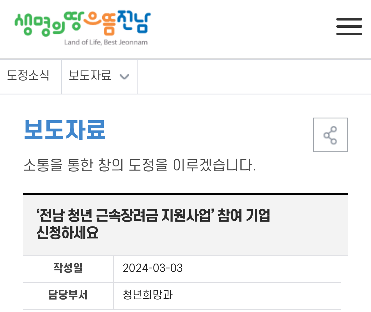 전남 청년 근속장려금 지원사업 참여를 바라는 기업은 소재지 시군에 직접 방문하거나 우편으로 신청하면 되며 자세한 사항은 도와 시군 대표 누리집 공고문을 통해 확인할 수 있습니다.