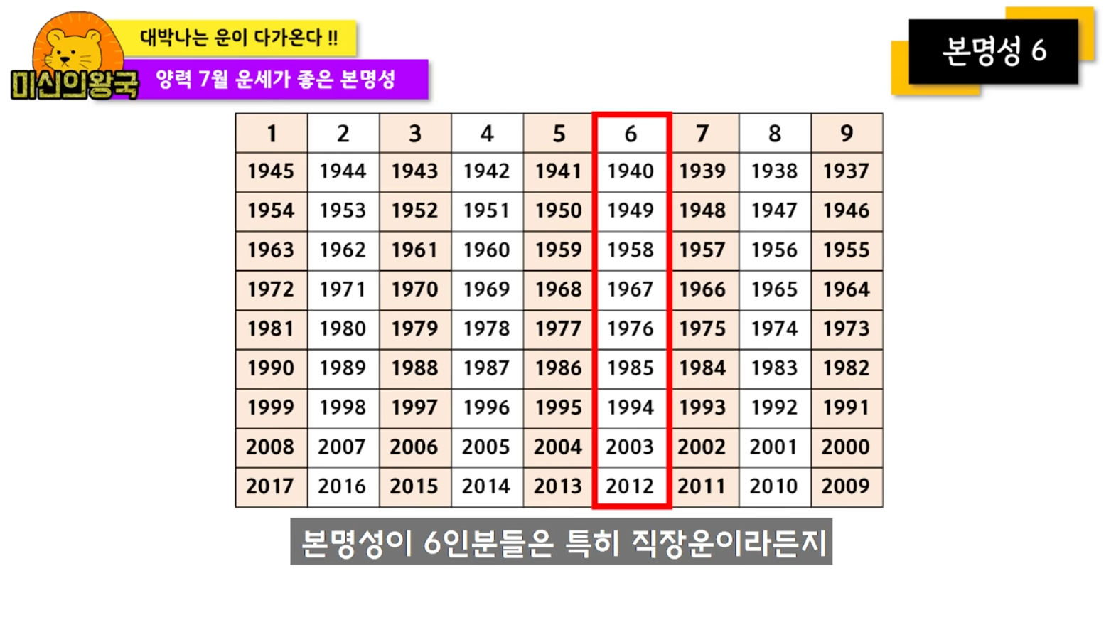 본명성 6은 1940, 1949, 1958, 1967, 1976, 1985, 1994, 2003, 2012년생입니다.