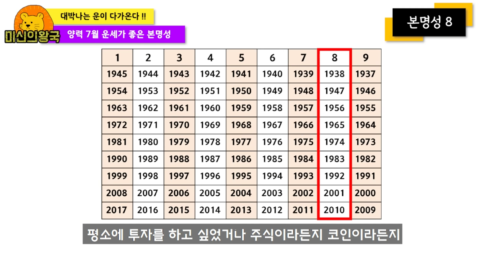 본명성8도 본명성6과 비슷하게 운이 좋은 띠입니다. 본명성8에 해당하시는 분은 주식, 코인과 같은 것에 투자하면 지금의 어려운 시기를 극복하는데 큰 도움이 될 것으로 예상됩니다.