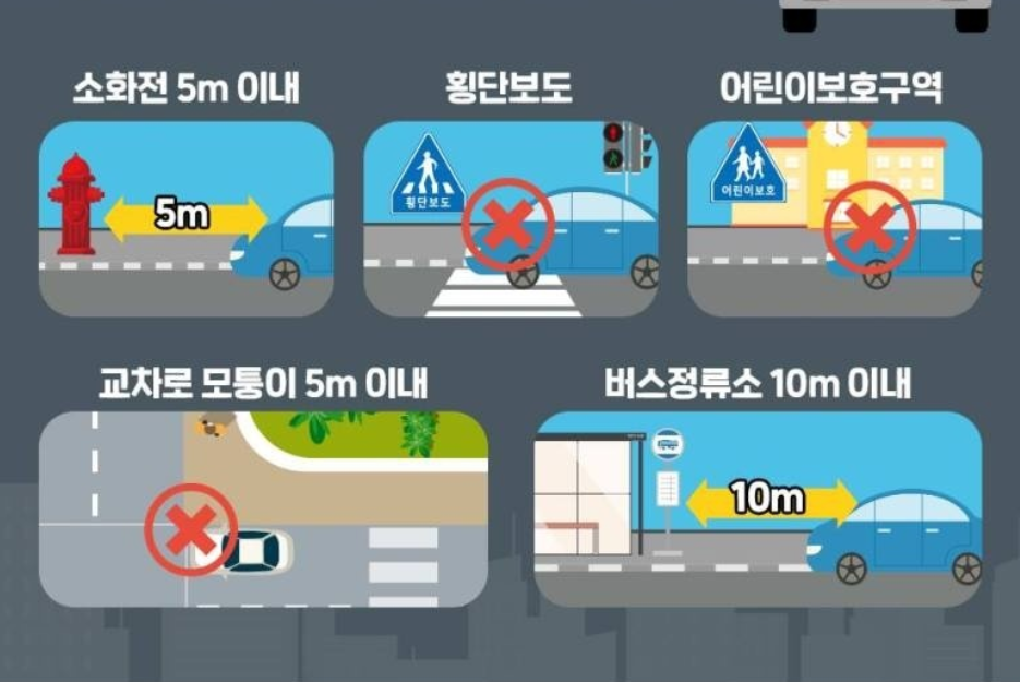 우선, 이유를 불문하고 절대로 주차하면 안되는 곳은 무조건 피해야 합니다. 대표적으로 알려진 5대 주정차 금지구역에 대해서 먼저 알아보겠습니다.