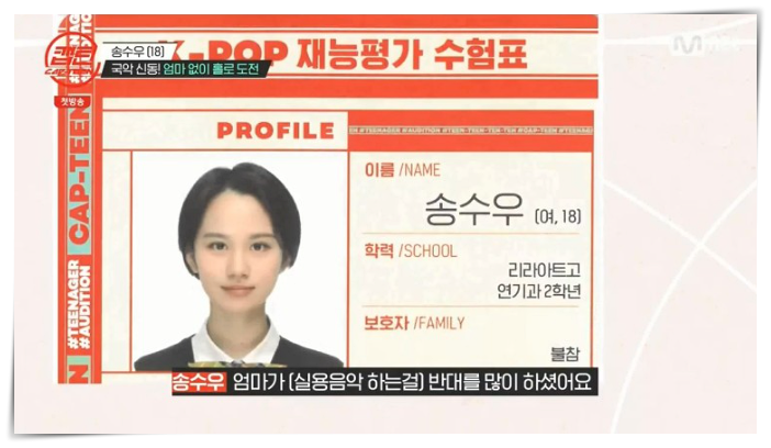 송수우씨는 국악전공을 하다가 실용음악을 하면서 부모님의 반대가 심했습니다. 이번 오디션 프로그램 내에서도 부모님이 불참을 했고 합격했지만, 전화 연결은 실패했습니다. 본인이 좋아해서 국악을 했기 보다는 부모님이 좋아해서 국악을 시작했다는 말이 있습니다.