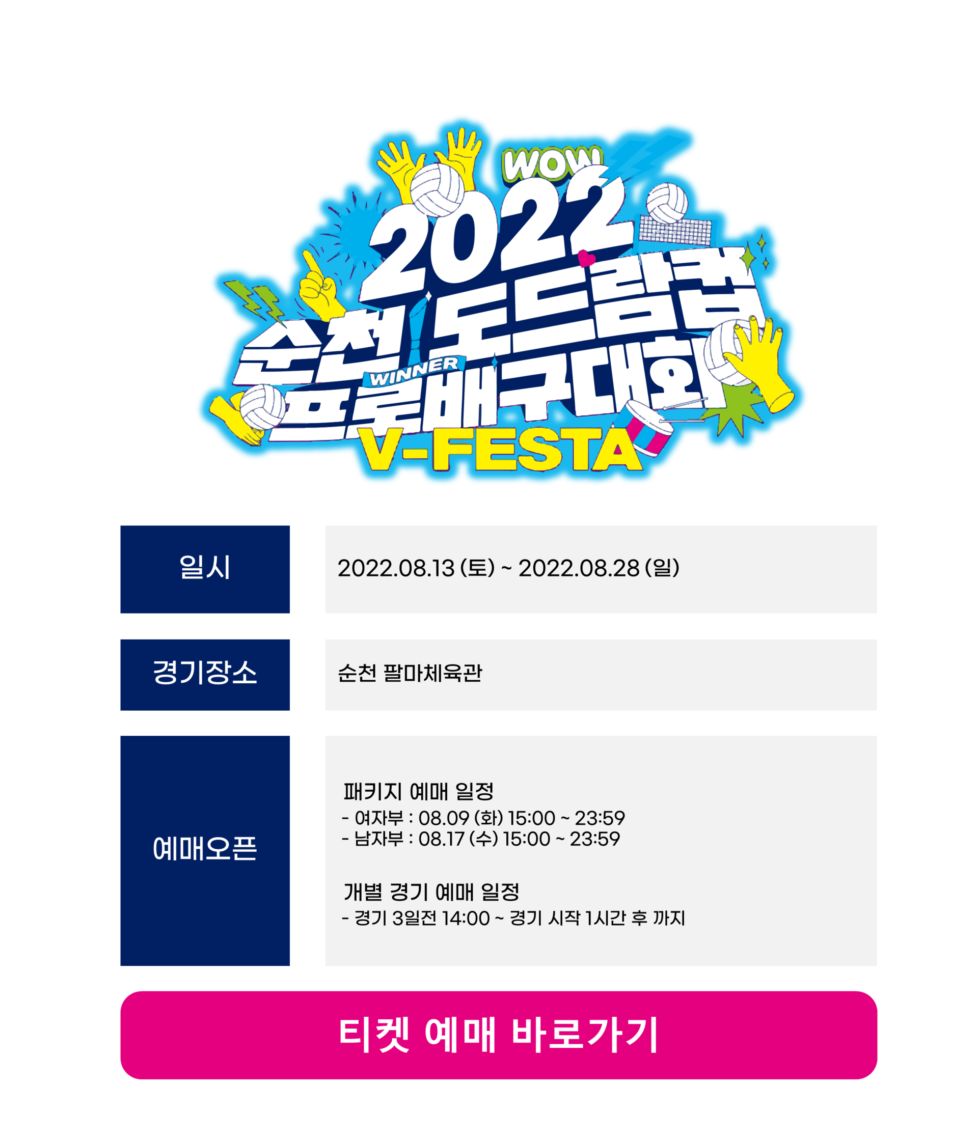 2022년 순천도드람컵 프로배구대회 티켓 예매는 하단 배너를 통해서 바로 확인할 수 있습니다.