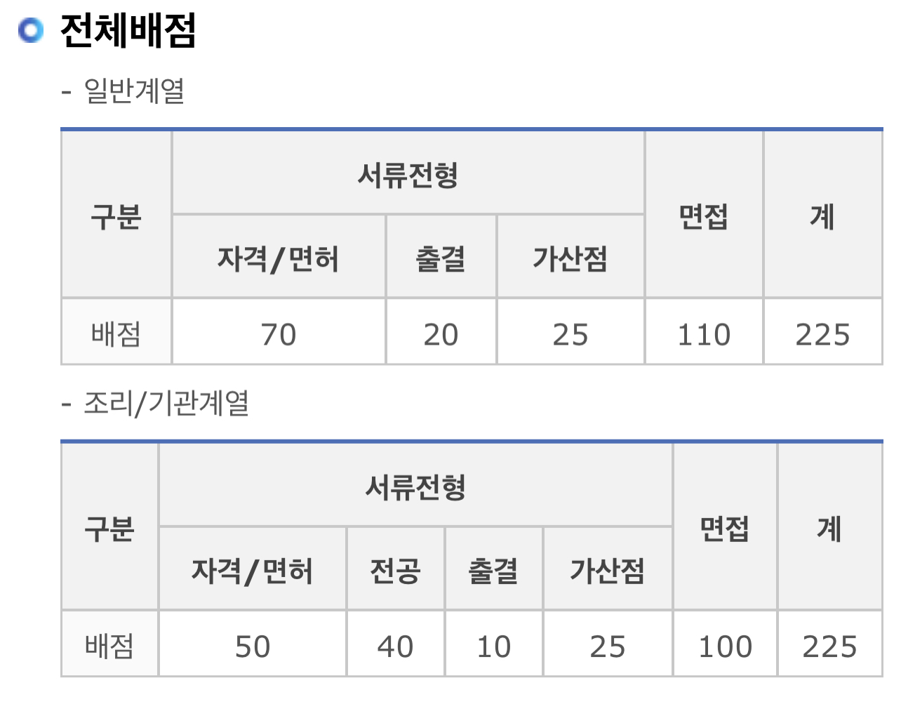 ➡️조리/기관계열: 자격·면허 50점, 전공 40점, 출결사항 10점, 면접 100점, 가산점 15점