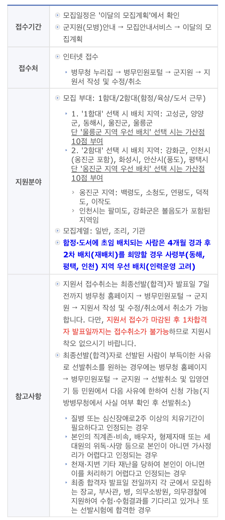 함정·도서에 초임 배치되는 사람은 4개월 경과 후 2차 배치(재배치)를 희망할 경우 사령부(동해, 평택, 인천) 지역 우선 배치(인력운영 고려)