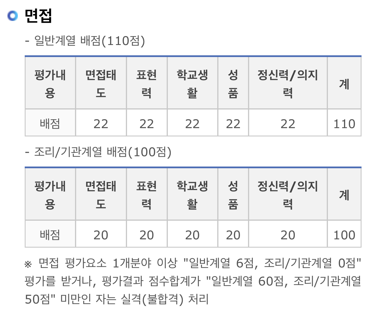 ➡️조리/기관계열: 면접 평가요소 1개분야 이상 "0점" 평가를 받거나, 평가결과 점수합계가 "50점" 미만인 자