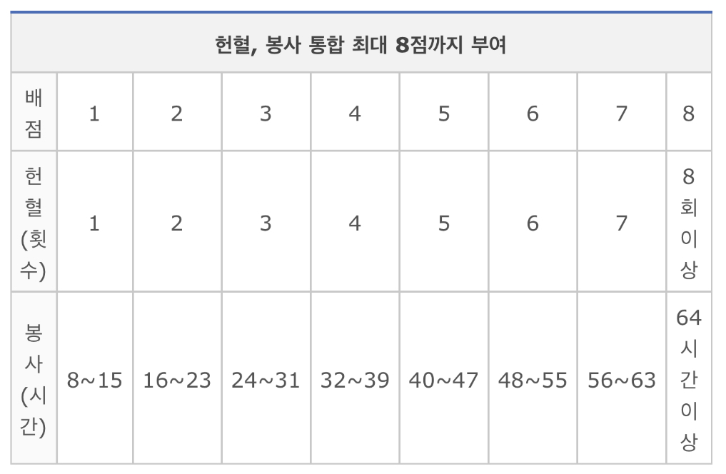 * 헌혈은 헌혈점수를 부여하며, 사회봉사시간으로 점부부여를 하지 않습니다. (중복 불가)