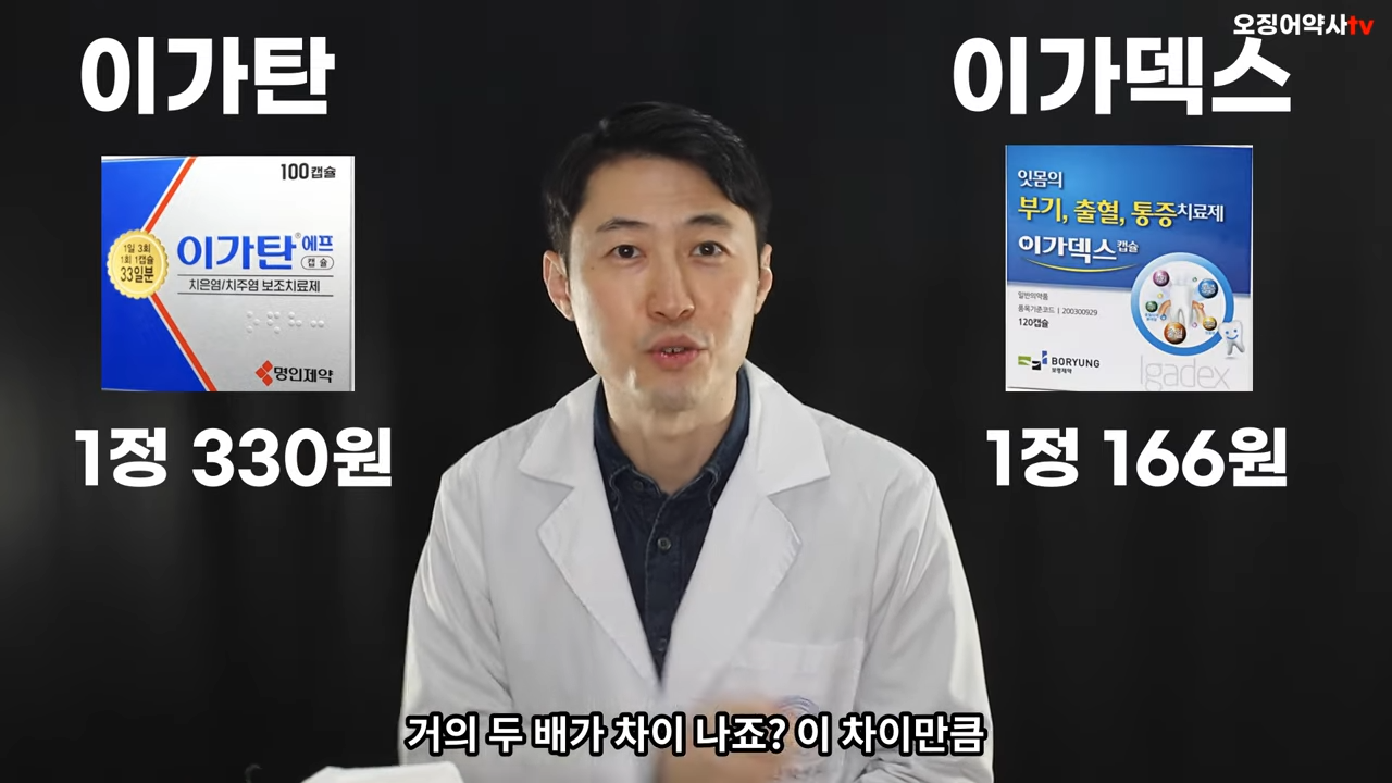 대표적으로 알려진 약인 이가탄과 동일한 성분인 이가덱스로 한번 알아보겠습니다. 이가탄과 동일한 성분인 이가덱스는 가격차이만 대략 2배 이상 차이 나는 것을 확인할 수 있습니다.