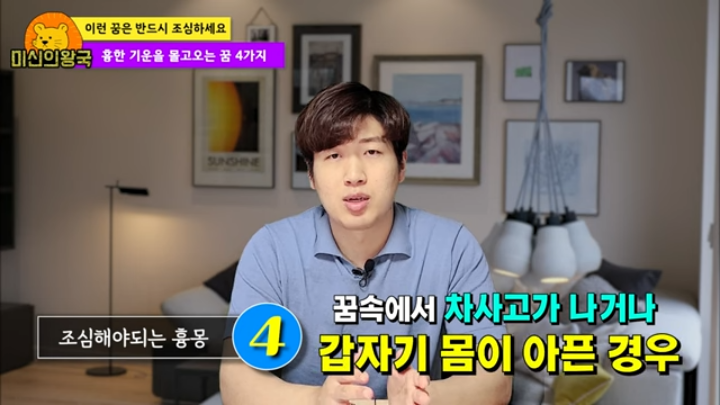 갑작스럽게 교통사고 또는 몸이 아픈 경우는 조금 특별합니다. 꿈 속에서 사고는 발생했지만, 피는 흐르지 않고 몸만 되게 아픈 경우 흉몽 중 1가지라고 알려져 있습니다. 이와 반대로 꿈에서 운전중에 물건 또는 물체에 박거나 사고로 인하여 죽음을 당하게 되면 좋은 꿈 중 1가지로 알려져 있으니 참고 바랍니다.