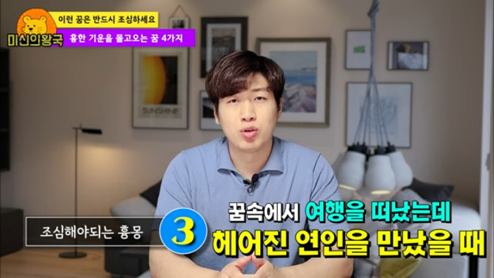 꿈 속에서 여행을 하게 되는데, 헤어진 연인과 만나는 꿈은 큰 일은 벌어지지 않지만 평소보다 운이 없거나 재수가 없는 경우가 많다고 합니다. 여행을 가는 것은 분명 좋은 꿈이지만 그 과정에서 본인의 연인을 만났다면 반드시 3일은 조심해야 한다는 것입니다.