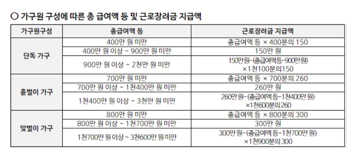 근로장려금은 가구원 구성, 재산, 급여액에 따라서 지급액이 달라집니다. 3가지의 조건이 1개라도 충족하지 않을 경우, 지급 받을 수 없으니 참고 바랍니다.