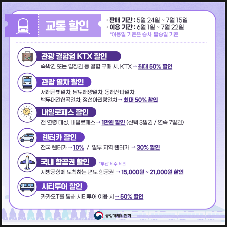 관광 결합형 KTX 할인, 관광 열차할인, 내일로패스 할인, 국내 항공권 할인, 시티투어 할인을 통하여 최대 50%까지 할인 받을 수 있습니다.
