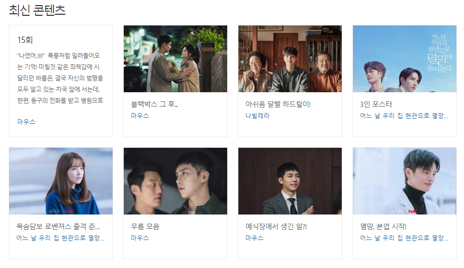 현재, 진행 중인 콘텐츠 이외에도 신규로 진행하는 스포츠, 드라마, 코믹 등 관련 내용들도 바로 확인할 수 있습니다. 특히, 짧은 영상들에 관련하여 간편하게 이어서 볼 수 있다는 것도 바로 확인할 수 있습니다. 콘텐츠 이외에도 프로그램에 대한 정보도 바로 확인 가능합니다. 우리가 알고 있는 마우스, 뒤돌아보지 말아요, 스타트업, 빈센조 등 관련 내용들도 확인이 가능합니다. 하단의 TVN 배너를 클릭하면 홈페이지로 바로 이동 가능하니 참고 바랍니다.