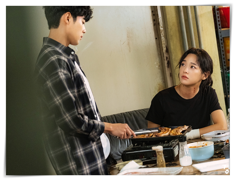 명인 포스의 주방여사 추매옥을 중심으로 칼자국 깊게 패인 건달 아우라의 주방 보조 가모탁